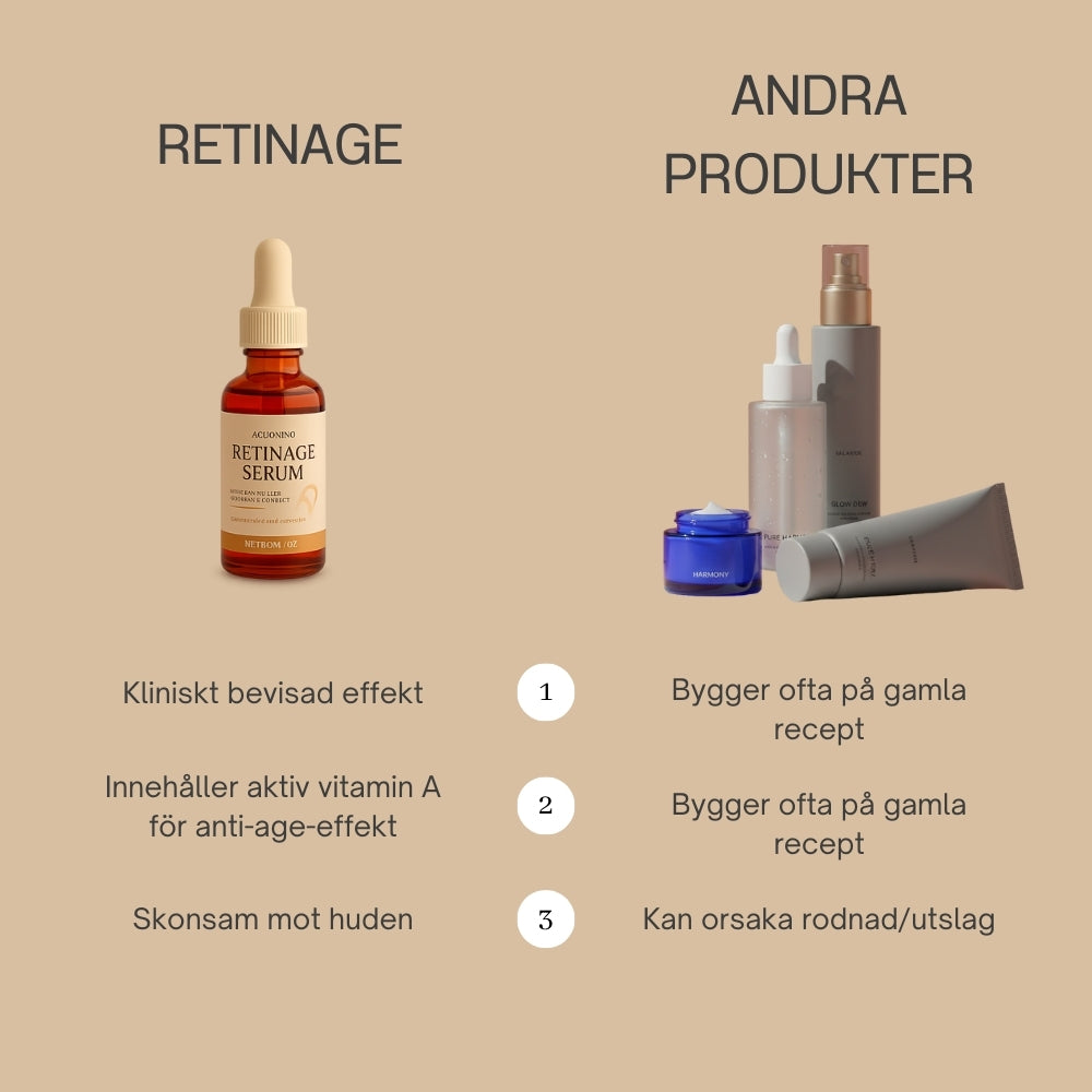 När huden åldras minskar återfuktning, cellförnyelse och spänst vilket leder till rynkor, trötthet och ojämn hudton, oavsett hur mycket kräm du använder. RetinAge återaktiverar hudens naturliga processer, stimulerar cellförnyelsen, återfuktar på djupet och gör huden fast och jämn igen. Det är inte magi, bara en formula som gör jobbet som huden slutat orka göra.
